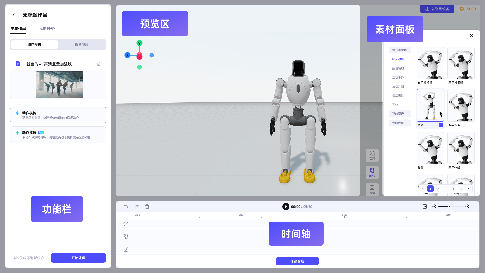 除了利用视频、音频帮助用户开发动作外,为了提升用户创作效率与便捷性,「灵创」平台为用户提供了官方素材库,涵盖11类场景超过180套标准化动作与140套表情模板,用户可以从素材库中直接调用动作、表情进行动作组合创作。